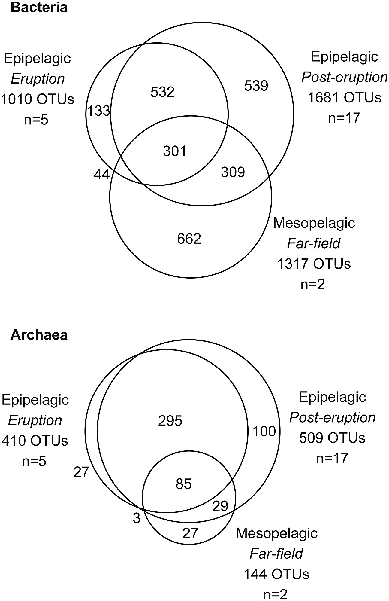 Venn Diagrams Of Shared 16s Rrna Gene Based Otus Between The Three Groups Of Samples Epipelagic During Eruption Epipelagic During Post Eruption And Mesopelagic During Post Eruption For Bacteria Top And Archaea Bottom