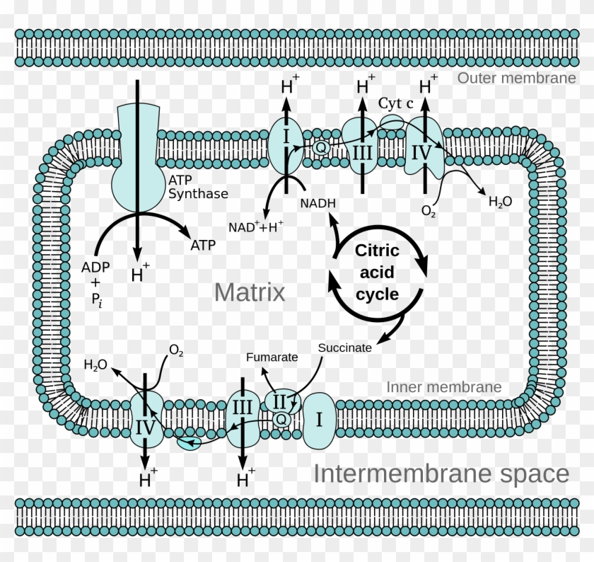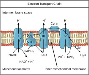 On the diagram above, the proteins are labeled I, II, III, IV, and Cytochrome C. The proteins in the membrane pass electrons from one to the other, this is known as the electron transport chain. The passing of these electrons allows ATP (adenosine triphosphate) to be generated. At the end of the electron transport chain, Cytochrome C passes the electron to its final acceptor, oxygen. Oxygen ...