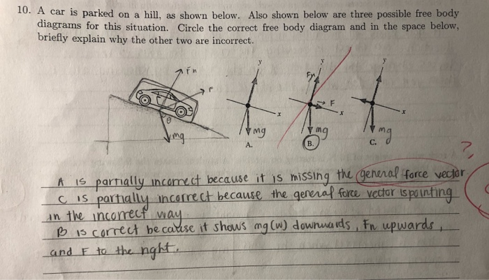 The car shown below is moving and then slams on the brakes locking up all four wheels. The distance between the two wheels is 8 feet and the center of mass is 3 feet behind and 2.5 feet above the point of contact between the front wheel and the ground. Draw a free body diagram of the car as it comes to a stop. Public Domain image, no author listed. Free Body Diagrams Practice Problems Construct free-body diagrams for the various situations described below. 1. A book is at rest on a table top. Diagram the forces acting on the book. 2. A girl is suspended motionless from a bar which hangs from the ceiling by two ropes. Diagram the forces acting on the girl. 3. Free-body diagrams Free-body diagrams are used to show the relative magnitude and direction of all forces acting on an object. This diagram shows four forces acting ... The car is coasting down the hill, there is dragging friction of the road (left pointing arrow) as well as gravity and normal forces, but no applied force. 6:30043 - Free-Body DiagramsIn this video Paul Andersen explains how free-body diagrams can be used to ...26 Aug 2014 · Uploaded by Bozeman Science