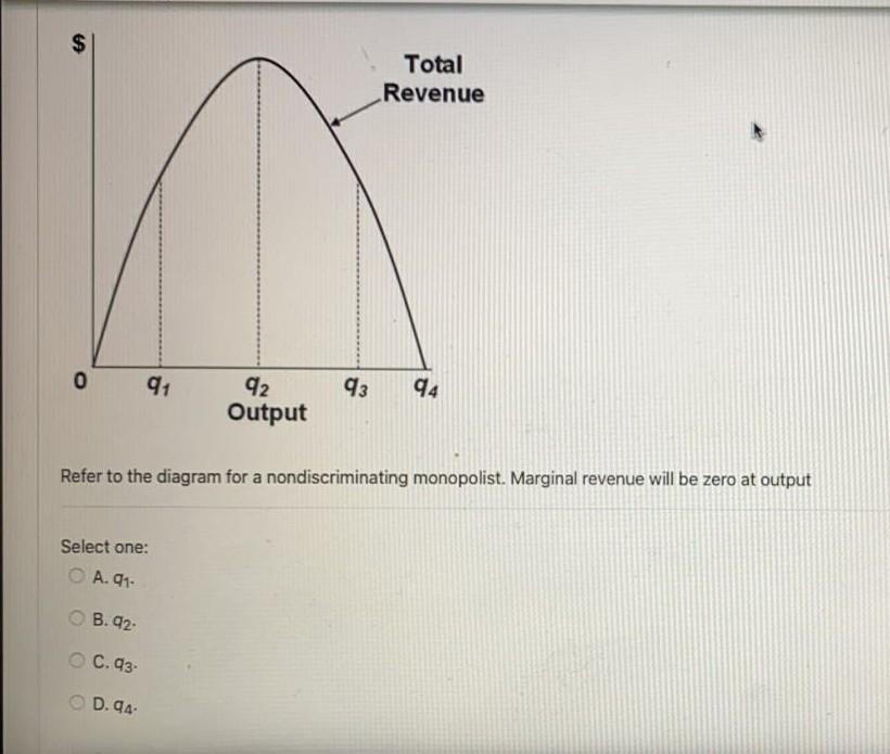 Refer to the diagram for a nondiscriminating monopolist. Marginal revenue will be zero at output: A. q1. B. q2. Correct C. q3. D. q4. Refer to the diagram for a nondiscriminating monopolist Marginal revenue will from ECON 1116 at ... Marginal revenue will be zero at output A. q1.B.q2. Refer to the diagram for a nondiscriminating monopolist. The profit-seeking monopolist will. answer choices. always produce at output q2.