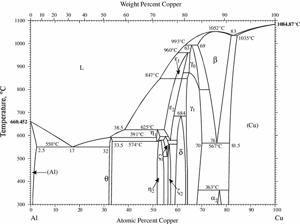Ftoxid fact oxide data 421 ftsalt salt data 284 ftmisc sulfide alloy micellaneous data 39. If you have any questions or good suggestions on... Фазовая диаграмма системы Al-Cu. К оглавлению: Другие диаграммы (Others phase diargams). Al-Cu (Aluminum-Copper) J.L. Murray The equilibrium solid The intermediate composition range of the diagram is inaccessible to thermodynamic modeling because of the absence of thermodynamic... This Al-Cu phase diagram shown only goes up to ca 60%, by weight, of Copper. and is "split" at around 54wt%Cu by a particular phase. The diagram up to the 54% point is very similar to the "standard" phase diagram. Intermetallic phases are not named " or $, but are assigned other Greek... PDF | The phase diagram of the Al-Cu binary system was reinvestigated experimentally. experimentally determined to be 779.6 C. All other parts of the Al-Cu phase diagram studied. here were found to be in very good agreement with the most recent previous descriptions.