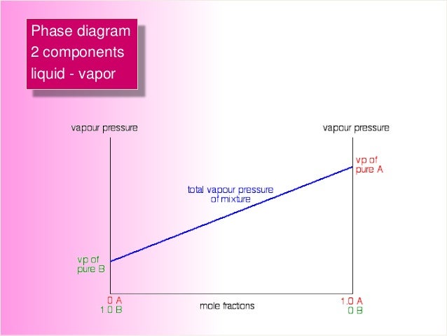 Liquid vapor phase diagram. A liquid-vapor phase diagram plots temperature of mixture versus the mole fraction or composition. A phase diagram of 2 components that will have differing molecular interactions causing mixture’s boiling point to rise/drop will show an azeotrope, in which there will be 2 lobes that either concave down/up depending on if there’s positive ... Chapter 8 Phase Diagrams. (b) The interpretation of diagrams. Point a represents the vapor pressure of a mixture with liquid composition xA and b represents the composition of the vapor that is in equilibrium with the liquid at that pressure. Note that when two phases are in equilibrium, P = 2, so F’ = 1. Vapor Liquid Phase Diagrams. Vapor-liquid equilibrium data may be obtained by experiment, by thermodynamic calculation, or in published sources. It is typically presented either in tabular form or as an equilbrium diagram. Diagrams may take several forms: boiling point diagrams Txy, Pxy diagrams ternary diagrams solubility diagrams In thermodynamics and chemical engineering, the vapor–liquid equilibrium (VLE) describes the distribution of a chemical species between the vapor phase and a liquid phase.. The concentration of a vapor in contact with its liquid, especially at equilibrium, is often expressed in terms of vapor pressure, which will be a partial pressure (a part of the total gas pressure) if any other gas(es ...