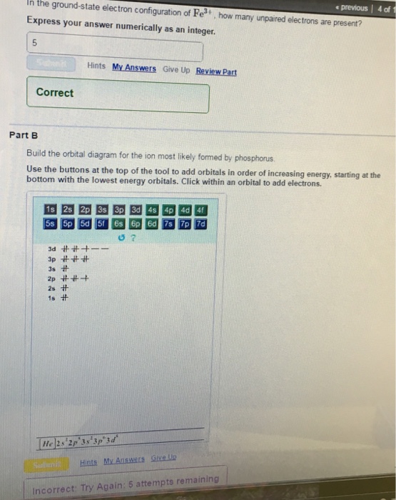 Express your answer numerically as an integer.Build the orbital diagram for the ion most likely formed by phosphorus. FREE Expert Solution. Iron (Fe) has an atomic number of 26. The ground state electron configuration of the Fe atom is: ... Build the orbital diagram for the ion most likely formed by phosphorus. Part B:Build the orbital diagram for the ion most likely formed by phosphorus. Phosphorous forms an ion with a charge of -3, which means it has the same electron configuration as Argon. That electron configuration is: 1s^2 2s^2 2p^6 3s^2 3p^6, Build the orbital diagram for the ion most likely formed by phosphorus. Use the buttons at the top of the tool to add orbitals in order of increasing energy, starting at the bottom with the lowest energy orbitals. Build the orbital diagram for the ion most likely formed by phosphorus? 1s22s22p63s23p3 is for Phosphorus and the most likely ion is to be a 3- because it wants to have a full outer shell ...