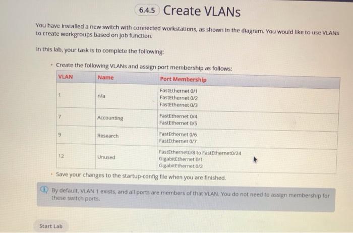 You would like to use VLANS to create workgroups based on job function. In this lab, your task is to complete the following: • Create the following VLANs and assign port membership as follows: VLAN Name Port Membership FastEthernet 0/1 FastEthernet 0/2 30 Jul 2018 — You are getting ready to add additional switches and would like ... The switch is currently connected to the router as shown in the diagram.