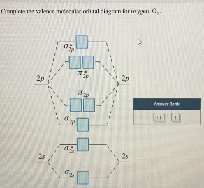 Complete the valence molecular-orbital diagram for oxygen, O, Answer Bank. Complete the valence molecular-orbital diagram for oxygen, O, Answer Bank Construct the molecular orbital diagram for He2 and then identify the bond order. Bond order: Click... Construct the molecular orbital diagram for He2 and then identify the bond order.