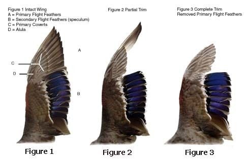 Wing clipping, the most common method of controlling the flight of backyard chickens, involves using sharp shears to cut off the first ten flight feathers of one wing. Clipping causes a bird to lack the balance needed for flight but lasts only until new feathers grow during the next molt, which may be a few months in young birds or up to a year ...