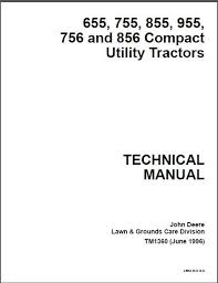 John Deere Lawn & Grounds Care Division 655, 755, 855, 955, 756 and 856 Compact Utility Tractors TM1360 (June 1996) ... parts kits, specifications, wear tolerances, and torque values. Binders, binder labels, and tab sets can be ordered by John Deere dealers direct from the John Deere Distribution Service Center. This manual is part of a total ...