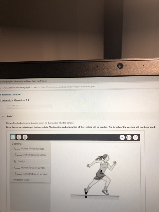 Draw a free-body diagram showing forces on the sprinter and the surface.. Draw a free body diagram showing forces on the sprinter and the surface. A free body diagram is a representation of an object with all the forces that act on it. Each force arrow in the diagram is labeled to indicate the exact type of force. The location and orientation of the vectors will be graded. Draw the vectors starting at the black dots. a. draw a free-body diagram showing all the forces on the crate if the conveyor belt runs at a constant speed. b. Draw a free-body diagram showing all the forces on the crate if the conveyor belt is speeding up. c. What is the maximum acceleration the belt can have without the crate slipping? d. Draw a free-body diagram showing forces on the sprinter and the surface. Draw the vectors starting at the black dots. The location and orientation of the vectors will be graded. The length of the vectors will not be graded. Please draw the 1)Normal force on surface, 2)static friction on surface, 3)gravity, 4)Normal force on sprinter and 5)static friction on sprinter. Oct 24, 2021 · Draw a free-body diagram showing forces on the sprinter and the surface. Draw a free-body diagram showing forces on the sprinter and the surface. Next 3. The purpose of the government is to a. establish justice. b. provide defense. c. secure liberty. d.