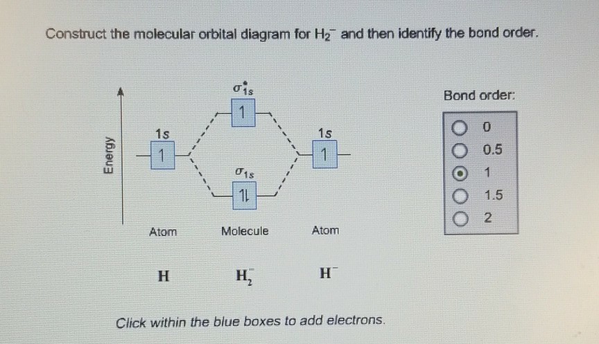 Answer to Construct the molecular orbital diagram for H2- and then identify the bond order. Bond order: Click thin the blue boxes. The hydrogen atom is the simplest atom, and its molecule \ (\ce {H2}\) is get a sigma (s) bonding orbital, denoted as s1s in the diagram here.