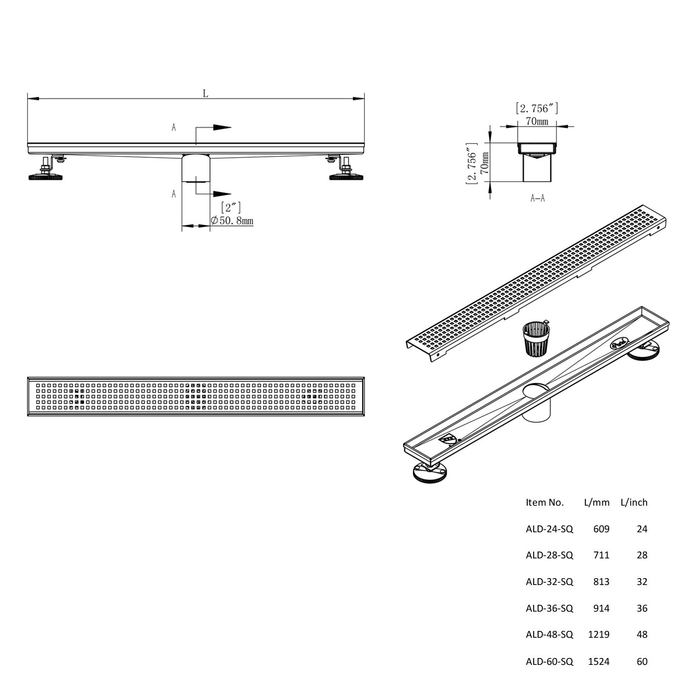 Shower Linear Drain 48 inch- Square Checkered Pattern Grate- Brushed 304 Stainless Steel- Adjustable Leveling Feet - Solid Color