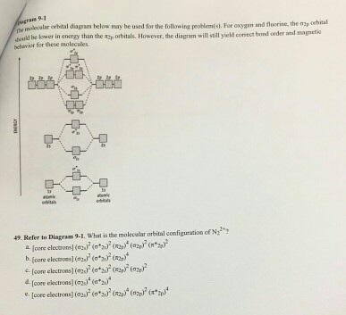 The splitting diagram should include the atomic orbitals for the atoms involved in the bond and the resulting molecular orbitals. Try to illustrate the correct ... Molecular Orbitals of the Second Energy Level. The 2s orbitals on one atom combine with the 2s orbitals on another to form a 2s bonding and a 2s * antibonding molecular orbital, just like the 1s and 1s * orbitals formed from the 1s atomic orbitals. If we arbitrarily define the Z axis of the coordinate system for the O 2 molecule as the axis along which the bond forms, the 2p z orbitals on the ... Problems. 1. (a) Give the molecular orbital electronic configurations of the N 2 and Ne 2 molecules. (b) Does the difference in the number of occupied bonding and anti-bonding orbitals agree with the number of electron pair bonds which a Lewis structure would predict for these two molecules? 2. Problem: Use the molecular orbital diagram shown to determine the bond order for NO +. Is NO+ paramagnetic or diamagnetic? In molecular orbital names, s = sigma and p = pi.a. 3, paramagneticb. 2, paramagneticc. 2.5, paramagneticd. 2, diamagnetice. 3, diamagnetic