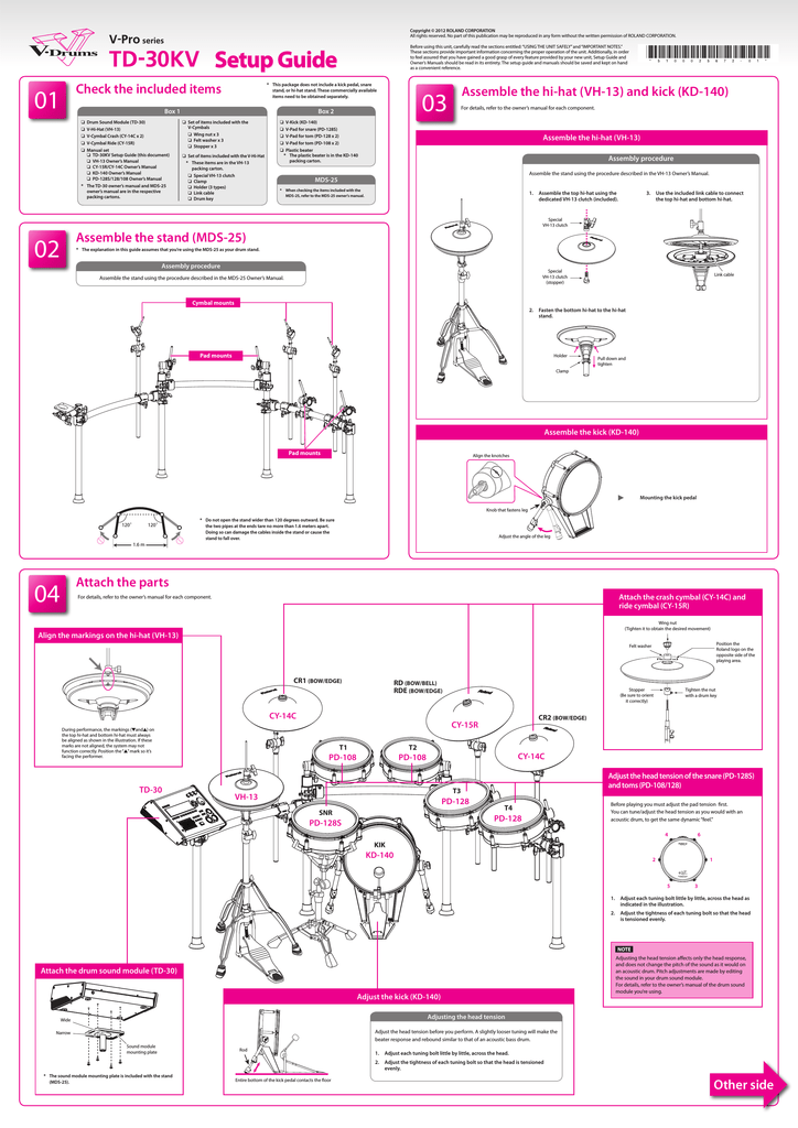 PDF TTD-9K Setup GuideD-9K Setup Guide - Roland Corporation Connect the AC adaptor and speakers Wing nut Felt washer Attach the snare (PDX-8) and toms (PD-8) Attach the hi-hat (CY-5) Attach the crash cymbal (CY-8) and ride cymbal (CY-8) Assemble the kick (KD-8) Upper clutch Clutch felt (large) Lower clutch Clutch felt (small) While pressing Use Drum Key to tighten