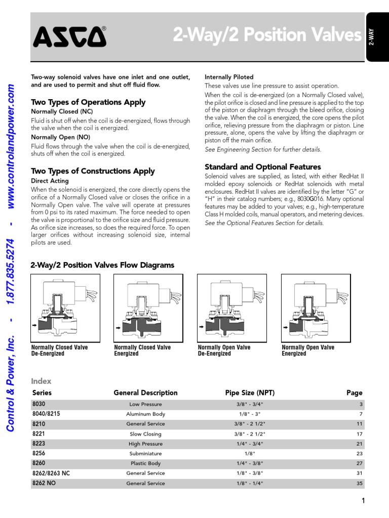 PDF 3/2 High Flow Direct Acting Valves 8327 - asco.store UL & CSA solenoid only approvals. Meets applicable CE directives. (General Purpose versions only) SIL 3 capable per IEC 61508. Third party certification by Exida. Refer to Engineering Section for details. Standard: For Brass Valves:Standard Solenoid enclosure is Types, 1, 2, 3, 3S, 4, and 4X. 8316G064 120/60 110/50 ASCO | 3-Way 8316 Solenoid Valve ... ASCO is the worldwide leader in the design and manufacture of quality solenoid valves. ASCO Red Hat brand valves offer the worlds largest selection of 2-Way, 3-Way, and 4-Way solenoid valves and are designed to handle the most demanding fluid control applications, including air, gas, water, and steam. Asco Solenoid Valve 8262 Wiring Diagram - schematron.org Asco Solenoid Valve 8262 Wiring Diagram. Series and valves are 2-way direct-acting general service below. To engage push type manual operator, push stem at base of valve body. HT or H. Avoid typical problems when installing a solenoid valve. Presented by Industrial Equipment Co. sales@schematron.org Solenoid Valves: ASCO Valve / Miniature Two ...