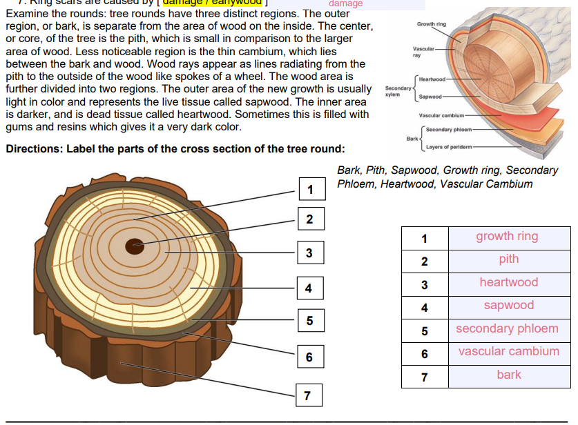 Tree Disks and the Cross-Sections of Tree Limbs, Trunks Tree cookies are the preserved cross-sections of tree limbs and trunks. These specimen disks illustrate the biology of annual tree rings and A tree cross-section disk or cookie can be one of the best botanical teaching aids to kids and adults on things happening in a tree and environmental... Xylem - Diagram, Types, Components, Structure, Function ... Xylems are dead cells found in stems, leaves and roots of the plants. In trees, it is found inside cambium the woody part of the tree extends through the trunk centre or to the pith and is transported to branches, foliage, etc. Xylem consists of xylem fiber cells, xylem parenchyma cells, and treachery elements. Wood Structure - Palomar College This basswood (Tilia americana) trunk cross section has 24 distinct annual rings.The central core of wood (#1 in close-up photo) counts as the first year of growth since the pith is no longer present. The smaller series of concentric rings (knot) at the bottom of the photo is a lateral branch embedded in the main trunk. PDF How A Tree Works! 2. Pass out tree "cookies" (cross sections of trunks) for learners to. - cambium (4). examine the interior of a tree. While learners are looking at the. - phloem (8). cookies, show them the attached diagram and have them locate the. - outer bark (12). different parts of the tree as you describe them.