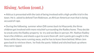 To Kill a Mockingbird Plot Diagram edited by Colleen Chen To Kill A Mockingbird Exposition Maycomb, Alamaba Great Depression period (1930's) Characters Scout, Atticus, Jem, Dill, Culpurnia, Boo Radley, neighbors town is build around poverty than wealth it is unknown how Jem broke his arm in the beginning Rising Action The rising action
