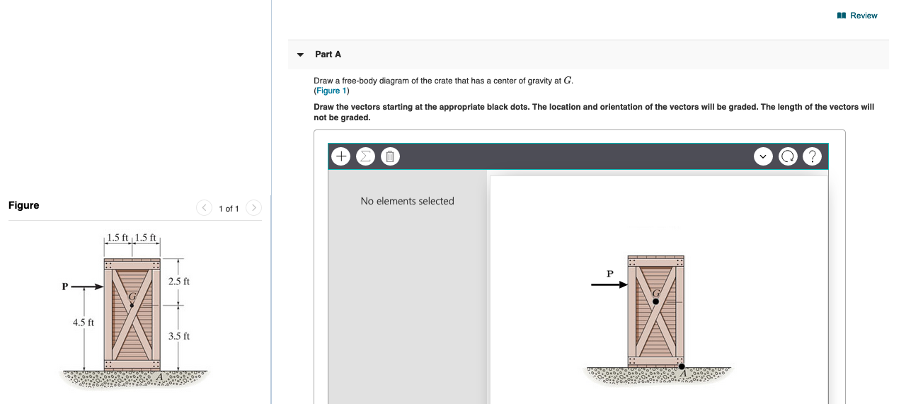 Engineering Mechanical Engineering Q&A Library • Part A Draw a free-body diagram of the crate that has a center of gravity at G. (Figure 1) Draw the vectors starting at the appropriate black dots. The location and orientation of the vectors will be graded. The length of the vectors will not be graded. No elements selected gure 1 of 1> 05 m, 0.5 m 0.8 m 1.5 m 1.2 m Select the elements from ...