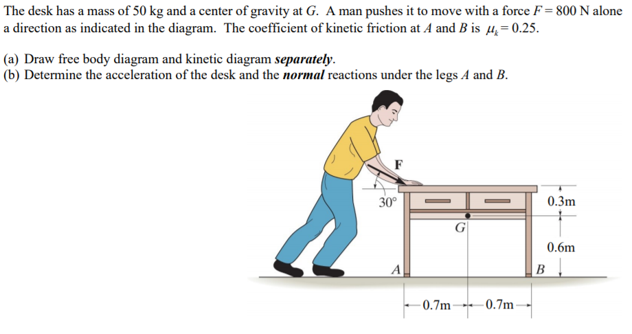 Draw a free-body diagram. Force of thrust is going up, force of drag and gravity is going down (arrow of force of gravity is bigger than the one of drag) ( force of thrust is the longest arrow) You've just kicked a rock on the sidewalk and it is now sliding along the concrete. The free-body diagram of the crate is shown in Figure(b). We apply Newton's second law in the horizontal and vertical directions, including the friction force in opposition to the direction of motion of the box. Solution. Newton's second law gives Draw the free-body diagram of the dumpster D of the truck, which has a weight of 5000 lb and a center of gravity at G. It is supported by a pin at A and a pin-connected hydraulic cylinder BC (short link). p g Given: F = 20 lb a = 1 in b = 6 in Solution: A x, A y, NB force of cylinder on wrench. Problem 5-8 Draw the free-body diagram of the automobile, which is being towed at constant velocity up the incline using the cable at C. The automobile has a mass M and center of mass at G. The tires are free to roll.