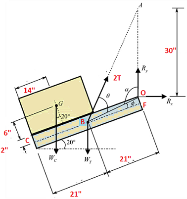 Draw the free-body diagram of the dumpster D of the truck, which has a weight of 5000 lb and a center of gravity at G. It is supported by a pin at A and a pin-connected hydraulic cylinder BC (short link). Explain the significance of each force on the diagram. Use the image below.