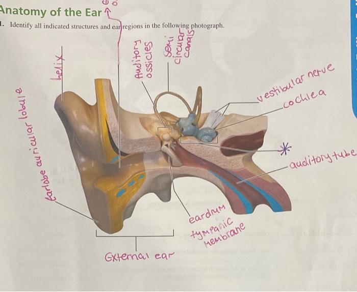 › homework-help › laboratory-manualSolved: Chapter E17 Problem 21E Solution | Laboratory ... - Chegg There are three parts of the ear, namely the external, internal, and the middle ear. The external ear comprises of the auditory canal (external) and the pinna. The middle one comprises of the ossicles, and eustachian tube. The external, and the middle ear is divided by the tympanic membrane. 2 THE ANATOMY AND PHYSIOLOGY OF THE EAR AND ... by PW Alberti · Cited by 141 — The ears are paired organs, one on each side of the head with the sense organ itself, which is technically known as the cochlea, deeply buried within the ...11 pages Solved Special Senses: Hearing and Equilibrium Anatomy of Identify all indicated structures and ear regions in the following photograph. 338 Review Sheet 19 2. Identify the structures of the middle and internal ear ...1 answer · Top answer: Pinna. Auricular lobule. External auditary canal. External ear . Middle ear. Semicircular canal. Vestibulocochlear n...