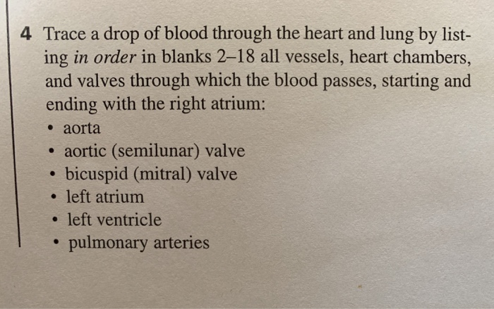 5. Trace a drop of blood as it flows through the heart ... 11. Complete the following matching exercise: 1. 5. Trace a drop of blood as it flows through the heart: Inferior vena cava and vena cava - valve ventricle arteries right and left lungs → atrium valve left atrium tricuspid valve pulmonary trunk → veins left valve aorta 6.
