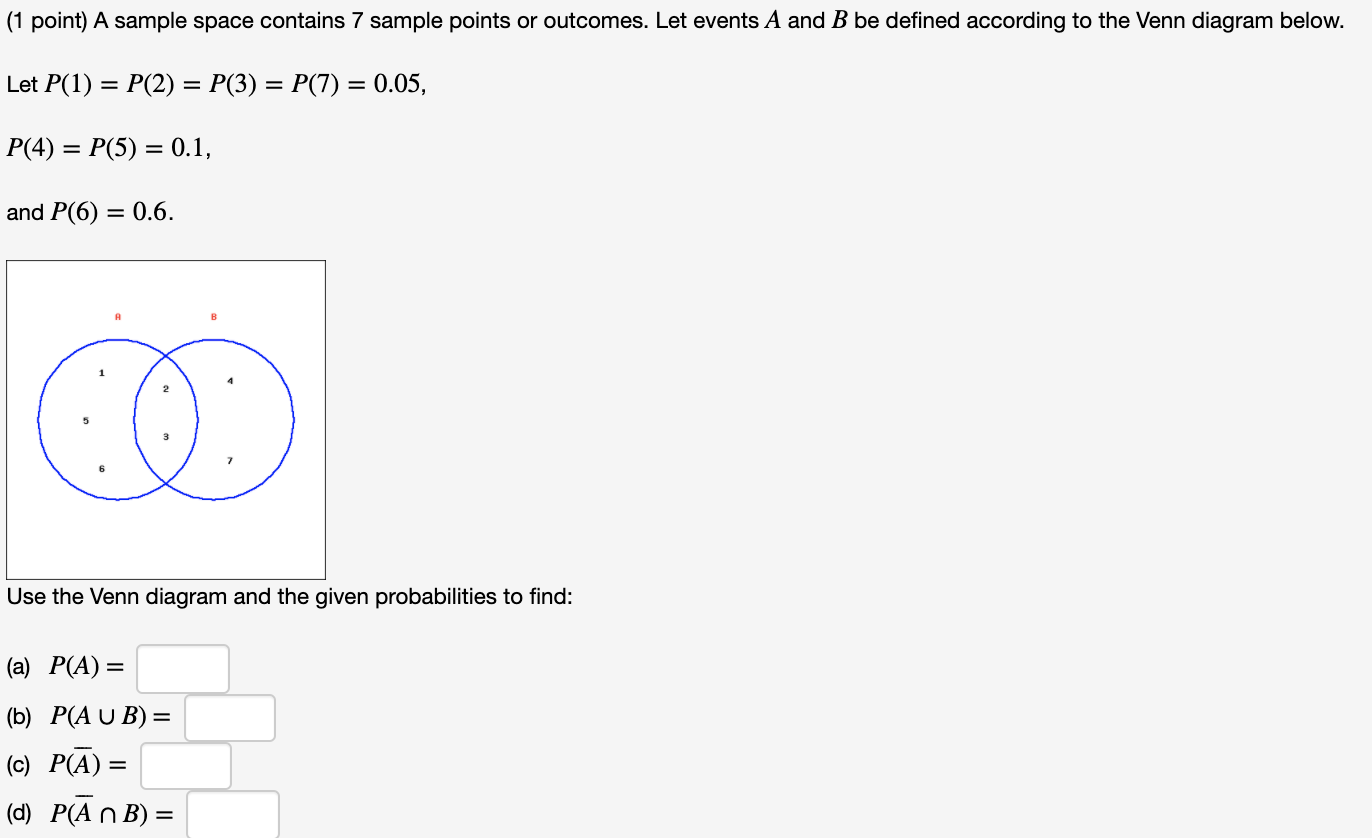 Solved (1 point) A sample space contains 7 sample points ... Transcribed image text: (1 point) A sample space contains 7 sample points or outcomes. Let events A and B be defined according to the Venn diagram below Let P(1) - P(2) P(3) = P(7) 0.1 P(4) - P(5) 0.05 and P(6) =0.5 Use the Venn diagram and the given probabilities to find (a) P( AB) (b) P(A) (c) P(AB) = (d) PB