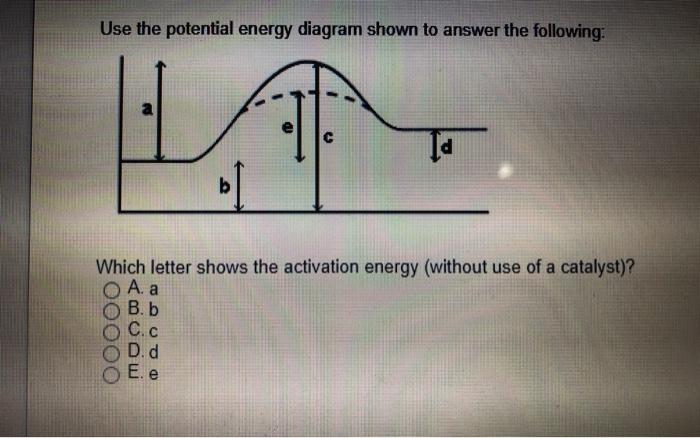 PDF Potential Energy Diagram Worksheet ANSWERS Potential Energy Diagram Worksheet ANSWERS 1. Which of the letters a-f in the diagram represents the potential ... A catalyst changes the reaction mechanism, in the process lowering the activation energy. 5. Name 4 things that will speed up or slow down a chemical reaction.