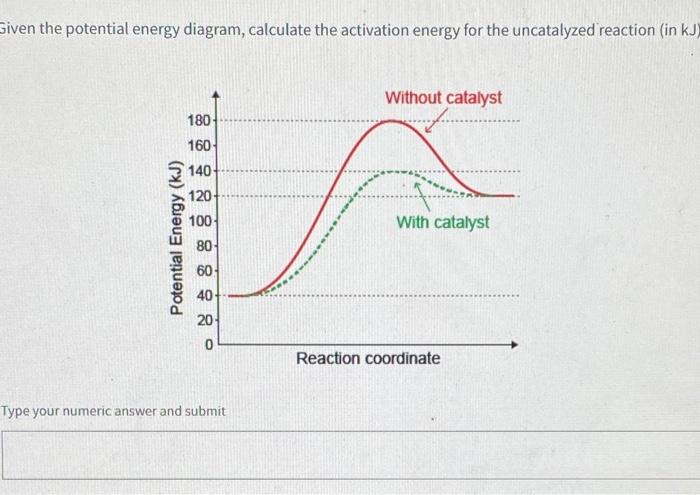 Solved H3.25-Level 1 Given the potential energy diagram ... Without catalyst 1801 160 140 120 100 80 60 40 With catalyst 0. 20 Reaction coordinate ; Question: H3.25-Level 1 Given the potential energy diagram, calculate the activation energy for the catalyzed reaction (kJ). Without catalyst 1801 160 140 120 100 80 60 40 With catalyst 0. 20 Reaction coordinate