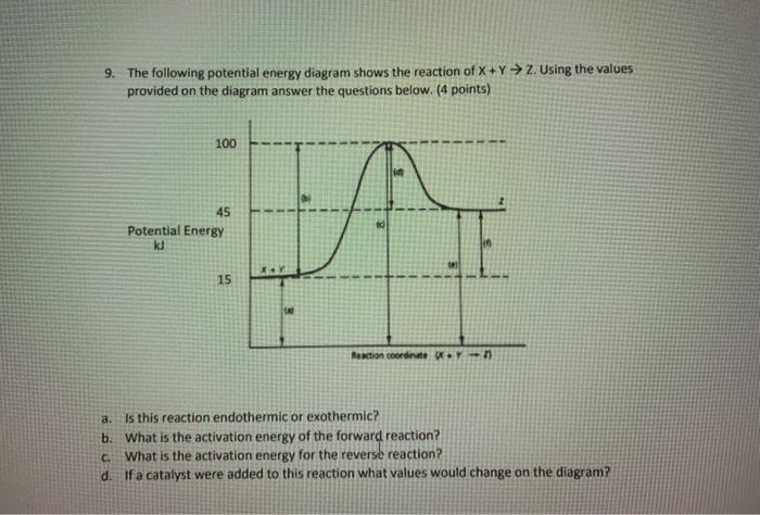 12.7 Catalysis - Chemistry - opentextbc.ca This potential energy diagram shows the effect of a catalyst on the activation energy. The catalyst provides a different reaction path with a lower activation energy. PDF Garden City Public Schools / Homepage Does this potential energy diagram represent an exothermic or an endothermic reaction? [Explain whv.] According to the diagram, is the potential eneoy of the products greater than, less than, or equal to the potential energy of the reactants? Draw an alTOW on the diagram above to represent the activation energy for the forward reaction. Label the