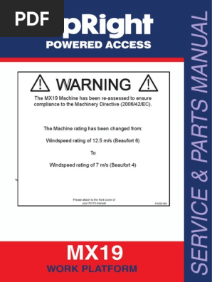 PDF Upright Scissor Lift Service Manual Upright Mx19 Scissor Lift Wiring Diagram - schematron.org Service Manual - First Edition iii Danger Failure to obey the instructions and safety rules in this manual and the appropriate Genie GS-1530 & Genie GS-1930 Operator's Manual will result in death or serious injury. Many of the hazards identified in the UPRIGHT MX19 SERVICE AND PARTS MANUAL Pdf Download ... See specifications for weight of work platform and be certain that forklift is of adequate capacity to lift the work platform. The MX19 may be forklifted from the rear end of the machine between the wheels. It may also be forklifted from the side using the forklift pockets shown in the diagram. Page 19: Maintenance PDF Welcome to WELCOME TO