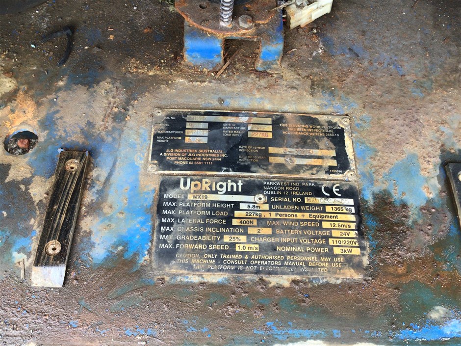 UpRight MX 19 Specifications & Technical Data (1994-2010 ... The MX 19 is categorised in the smallest machine segment in the wheeled scissor lifts category. The MX 19's size is 0.76m x 1.75m x 2.13m. This 1460kg model can operate with 227kg of net load. This Wheeled Scissor Lift from UpRight can provide a working height of 7.8m. The 2.54m by 0.72m platform of this model is designed for 2 persons.