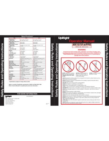 UPRIGHT MX19 SERVICE AND PARTS MANUAL Pdf Download ... See specifications for weight of work platform and be certain that forklift is of adequate capacity to lift the work platform. The MX19 may be forklifted from the rear end of the machine between the wheels. It may also be forklifted from the side using the forklift pockets shown in the diagram. Page 19: Maintenance