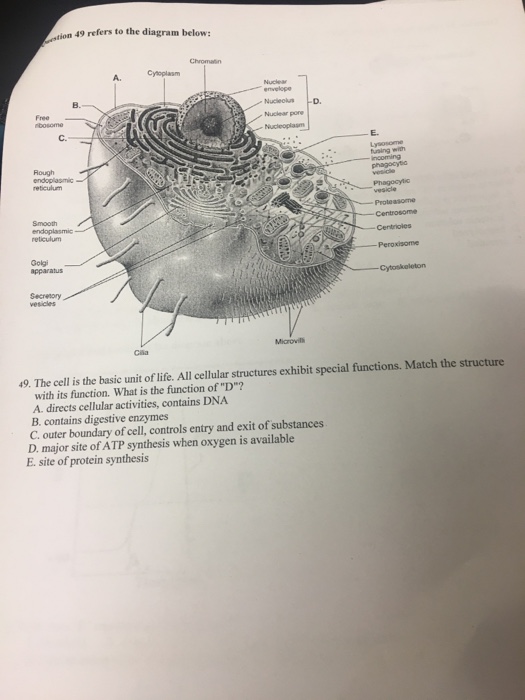In the diagram, this structure directs cellular activities.. Q4. Fill the diagram below: 1. In the animal cell shown ... Q4. Fill the diagram below: 1. In the animal cell shown, structure A is the site where___ occurs. 2. In the animal cell shown, structure C is the____ organelle that directs the cell's activities. 3. In the animal cell shown, structure D is the____ plays a role in protein production. 4. In the animal cell shown, structure E is the___ WHAT DIRECTS ALL CELL ACTIVITIES on ocfaitymmya ... What is the name of the cell structure that directs all activities of the cell? These components include- cell wall, cell membrane, cytoplasm, nucleus, and cell organelles. What directs all the activities? All cells store DNA and direct itself to do cell activities that it normally would do. Solved The cell is the basic unit of life. All cellular | Chegg.com All cellular structures exhibit special functions. Match the structure with its function. What is the function of "D"? A. directs cellular activities, contains ...1 answer · Top answer: ANSWER - OPTION A The function of the nuclear region is to direct all cellular activities and it contains DNA. The Nucleus of the cell is a membrane ... test-bank (30).pdf - Test Bank - Principles of Anatomy and ... Test Bank - Principles of Anatomy and Physiology, 12th Edition, by Bryan Derrickson, Gerald Tortora In the diagram, which organelle aids movement of the cell? a. A b. G c. H d. D e. I Ans: A Difficulty: medium Feedback: 3.4 55.55.